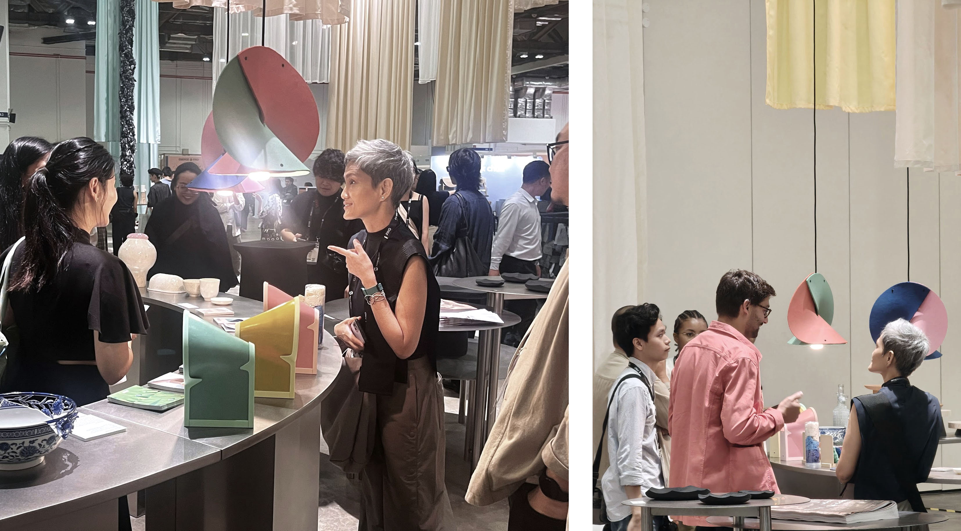 Showcasing Aureole Design’s “Fold Light Series” at EMERGE 2025. As part of an initiative to reduce waste, Aureole Design's Fold light series reimagines defective gloves by transforming them into new applications and design expressions. The pendant lights are crafted using 'Beyon Rubber', a patented recycled nitrile gloves by Big Hand Creation Sdn Bhd in collaboration with Geomax Rubber Innovation Products Sdn Bhd.